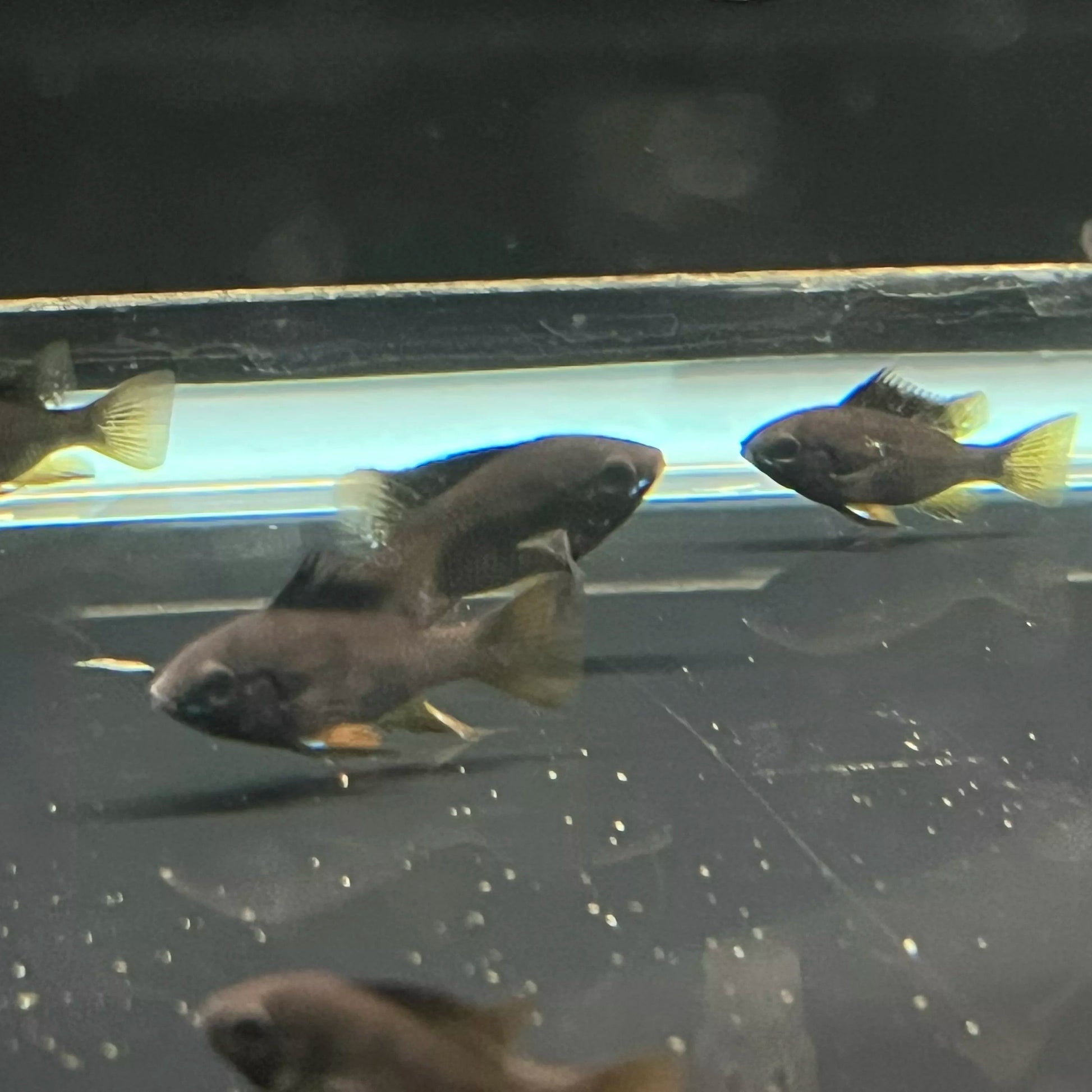 Superbe cichlidé nain à la robe noire veloutée rehaussée de reflets bleus irisés. Paisible et plein de personnalité, il devient la vedette idéale des aquariums plantés communautaires.