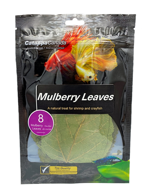 Les feuilles de mûrier constituent une source de nourriture naturelle et un habitat pour les crevettes et certaines espèces aquatiques. Ces feuilles sont récoltées sur le mûrier, un arbre originaire d'Asie, mais qui a depuis été introduit dans d'autres régions du monde. Les feuilles de mûrier constituent une alternative naturelle et durable aux aliments transformés pour poissons.